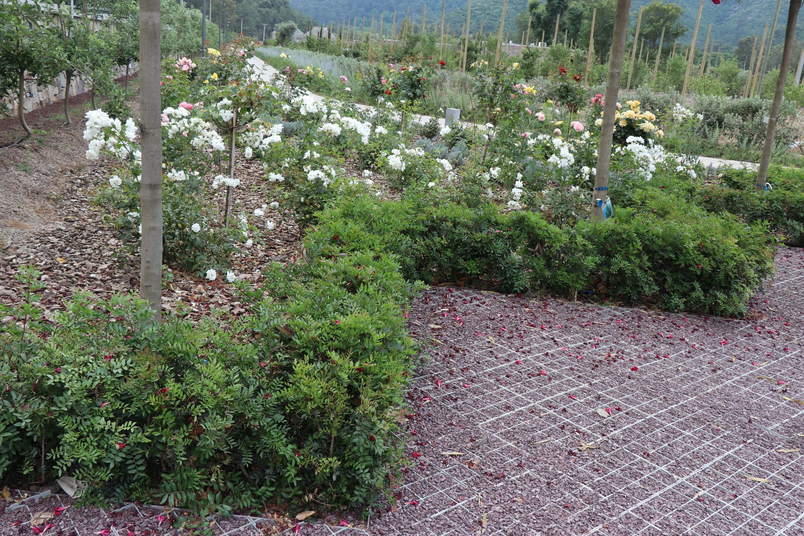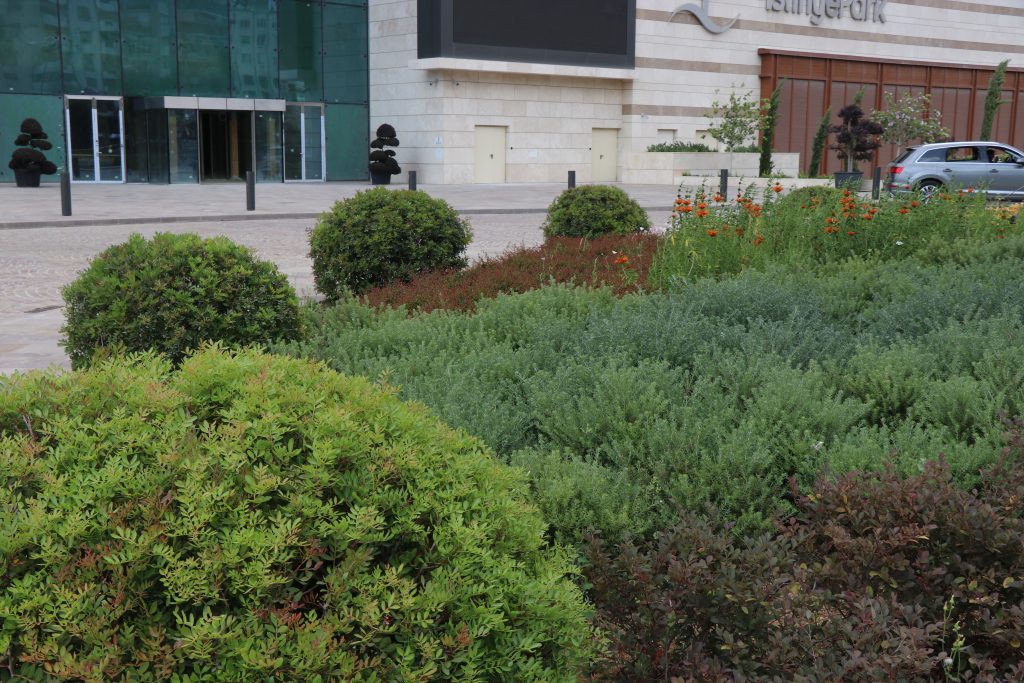 Peyzaja uygulanmış fotoğraflarını gördüğünüz bitkilerin hepsi ülkemiz doğasında da gördüğümüz çeşitler. Örneğin Pistacia lentiscus (Sakız çalısı) Ege ve Akdeniz’in iç kısımlarında bile rastlanan maki bitki topluluğunu oluşturan asal bireylerdendir. Dokunduğunuzda baharatlı kokusunu hissedebilirsiniz. Fotoğraf,1-2-3-4’te görüldüğü gibi araç park alanının çevresinde kısa boylu çit olarak kullanılmış ve oldukça etkili bir görünüm sağlamış. Yine aynı bitkinin büyük toplar şeklinde kullanımını da öyle.