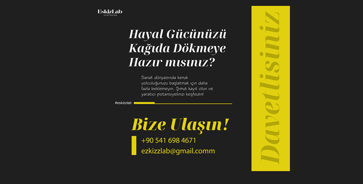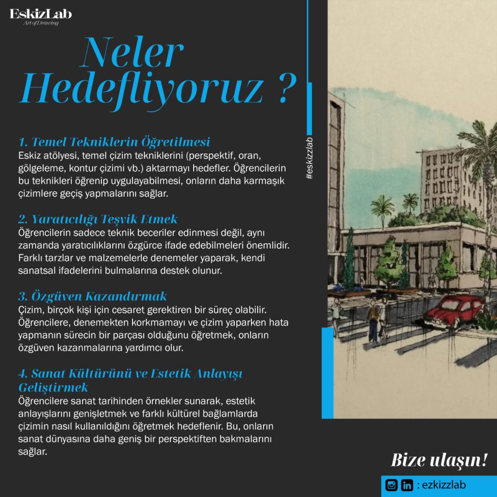 Eskizlab amacını, “Hayal gücünüzü kağıda dökmeye hazır mısınız” mottosuyla öne çıkarıyor. Yine “Sanatın büyülü dünyasına adam atmak ve yeteneklerini geliştirerek bir üst seviyeye çıkarmak isteyenlerle buluşmak, sanat tarihinden örneklerle estetik anlayışını geliştirmek” olarak tanımlıyor.