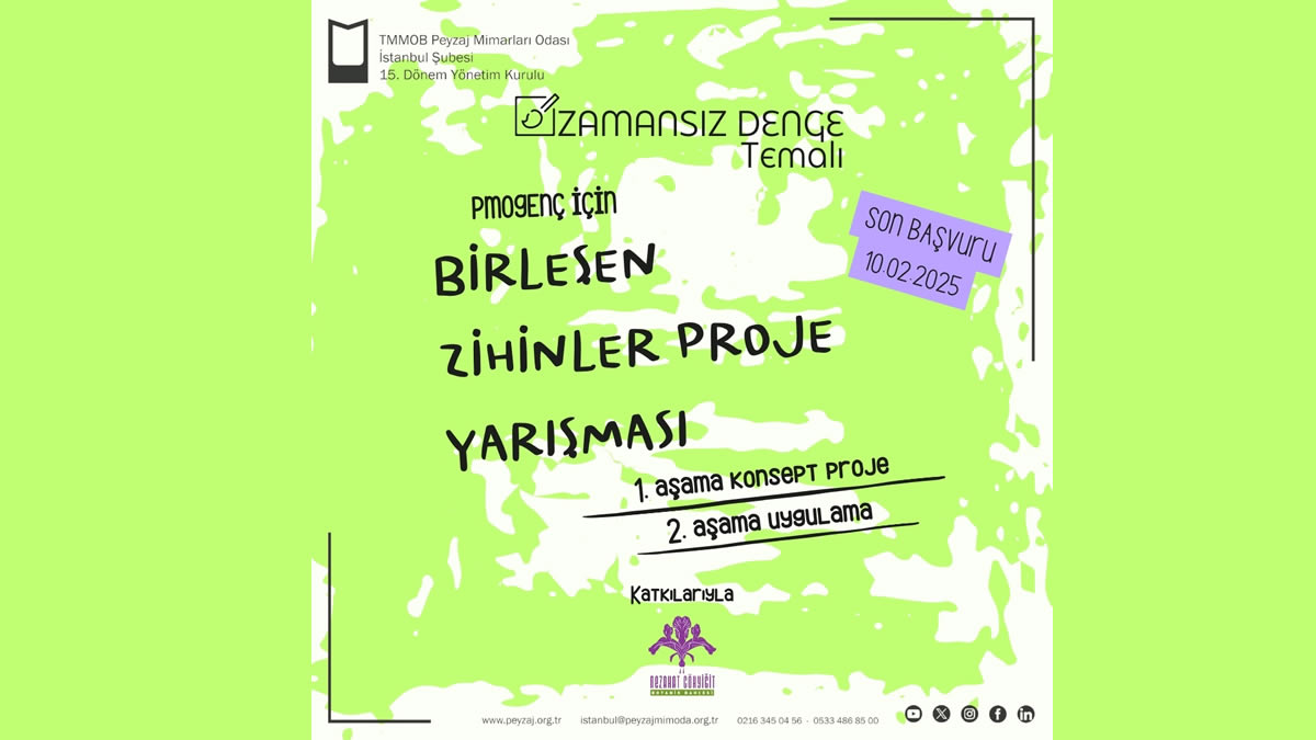 TMMOB Peyzaj Mimarları Odası İstanbul Şubesi’nin organize ettiği “Birleşen Zihinler Proje Yarışması”nın teması “Zamansız Denge.” Katılım ücretsiz ancak PmoGenç üyesi olmak veya proje teslimine kadar üyelik işlemlerini tamamlama şartı aranıyor. Her türlü sorulara cevap almak, belge ve bilgiye ulaşmak için: https://www.peyzajmimoda.org.tr/icerik/zamansiz-denge-temali-birlesen-zihinler-oegrenci-proje-yarismasi-hk-202412161235