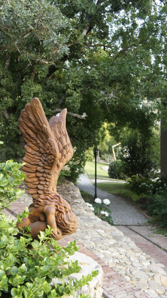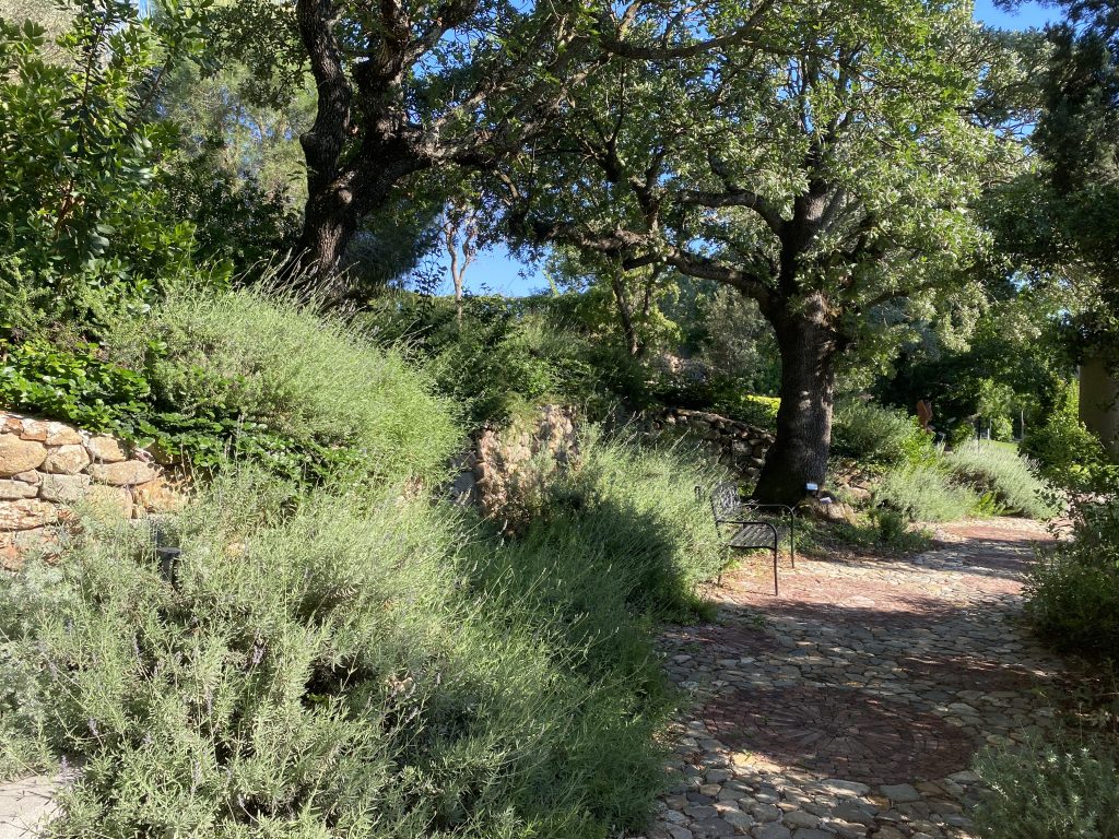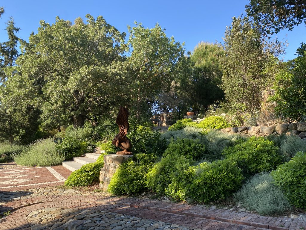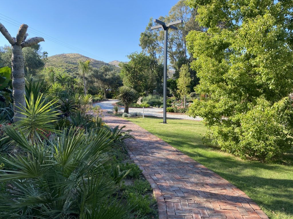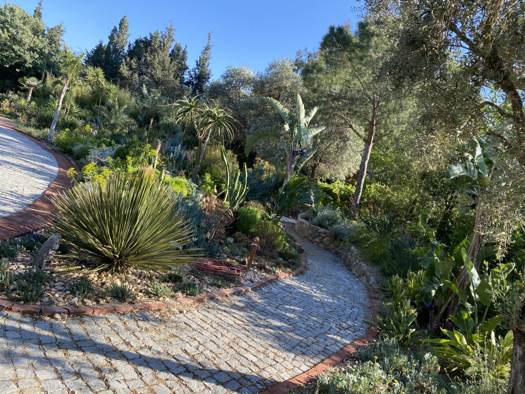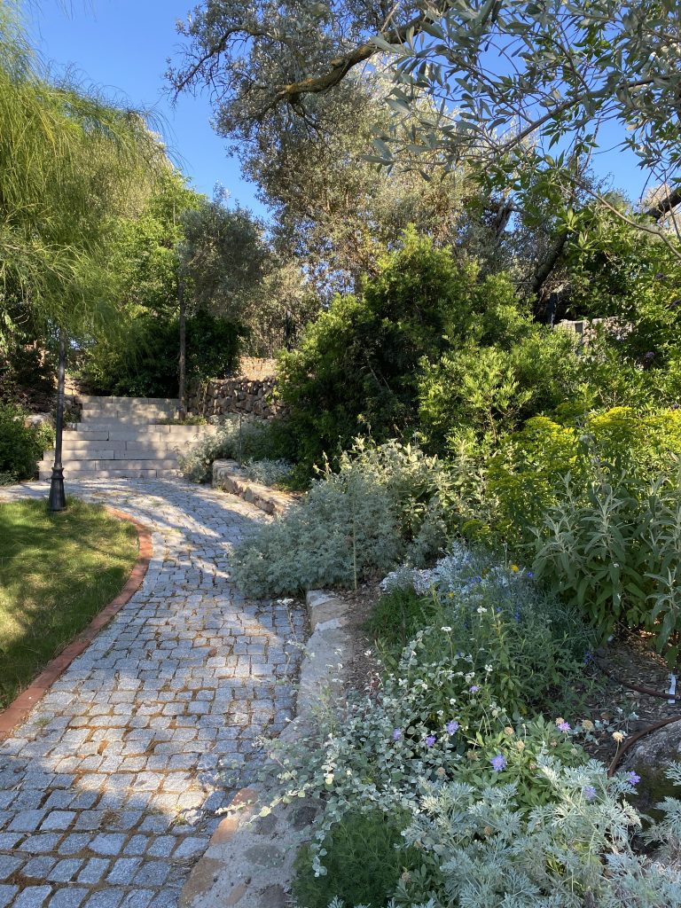 Bahçeyi gezdikçe sadeliği, sıcaklığı ve rahatlığı hissediyorsunuz. Bahçenin duvarları bahçeden çıkan taşlarla yapılmış örneğin. Yine bazı zeminlerde kullanılan pişmiş toprak terracotta altlarına beton kullanılmadan oturtulmuş. Yürüyüş yollarında ve basamaklarda kullanılan taşlar, çok yakındaki bir köyden çıkan kayalardan elde edilmiş.