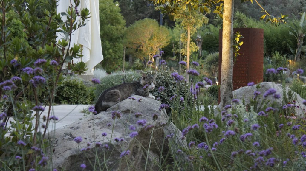 Hasılı beton kullanımından özellikle kaçınmışlar. Rino’s Garden ekolojiye, çevreye dost bir tasarım ve malzemeyle tamamlanmış. Bahçede kullanılan bitkilerin hemen hepsi dünyadaki bitki topluluğunun yüzde onunu oluşturan Akdeniz bitki türlerinden oluşuyor… Örneğin çim yok denilecek kadar az.