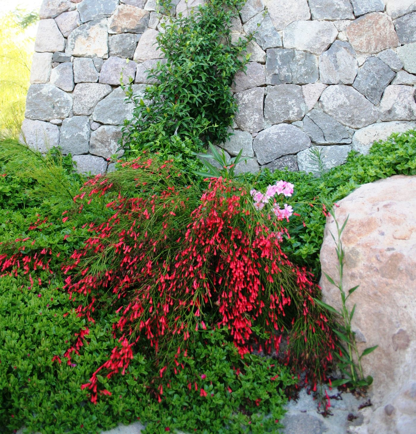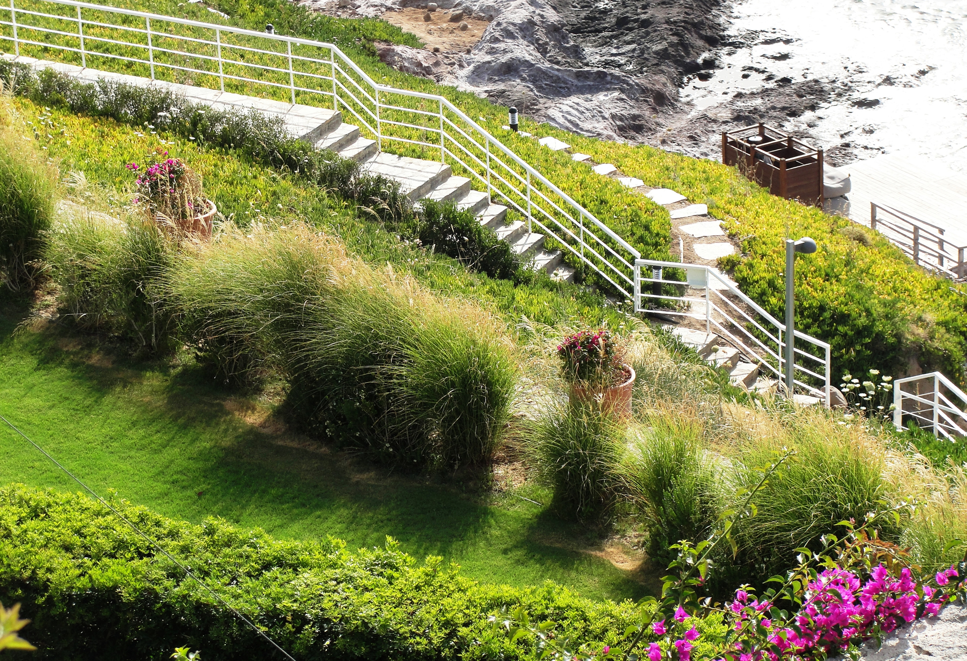 Projede bitkisel tasarımın yanında kullanılan yapısal elemanlar da peyzajda bütünlüğü oluşturmuş. Duvar ve merdivenlerdeki kullanılan taş, oranın asırlar öncesinden kaldığı izlenimini veriyor. O dik merdivenler bile keyifle çıkılır hale gelmiş etrafındaki peyzaj tasarımıyla birlikte.