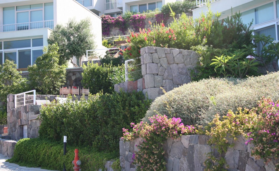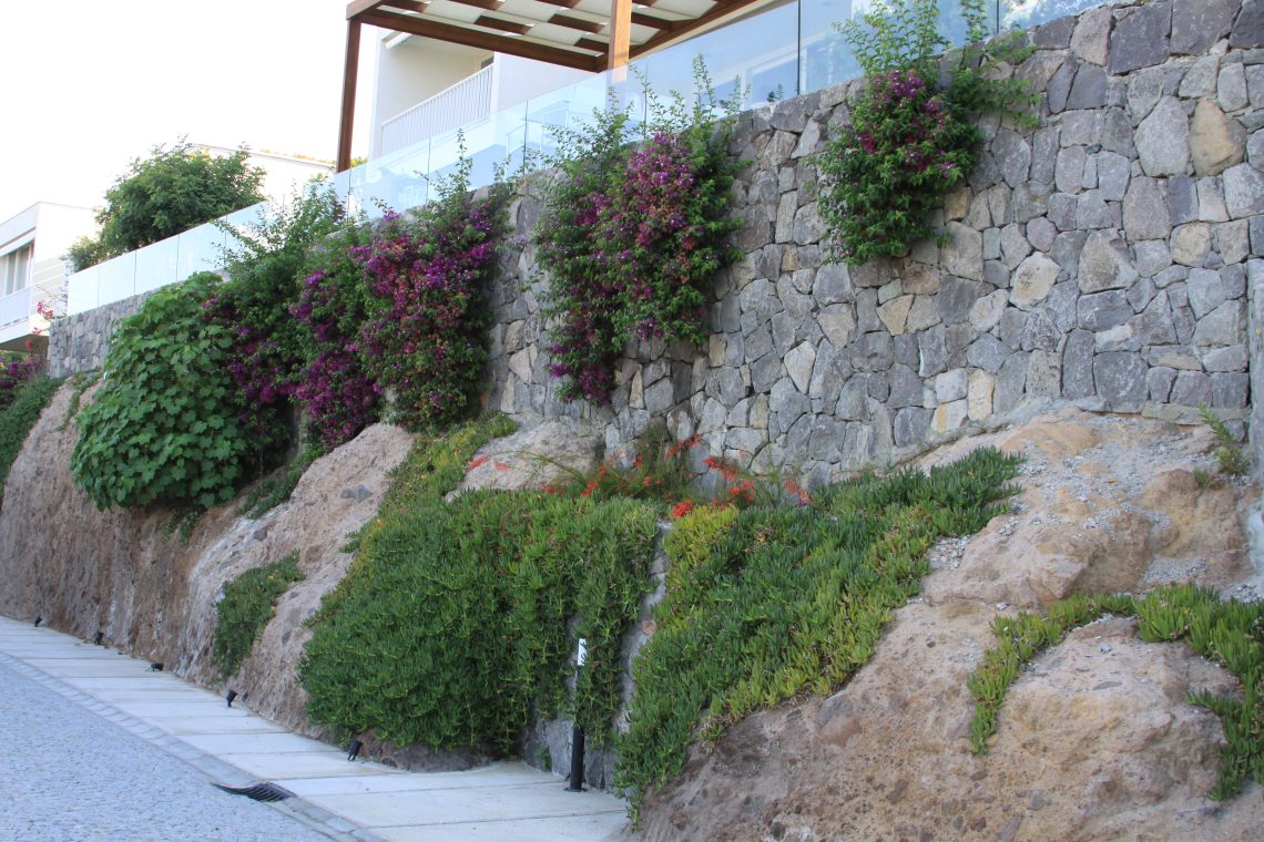 Yeşil Vadi’nin peyzaj tasarım ve uygulamasını yaptığı Tekfen Yalıkavak Evleri, kayalık ve dik yamaçlarda yapılabilecek peyzaj çalışmaları için örnek bir proje.Hatta bu kayaların drenajı bile hesaplanarak fazla suyu sızdırması için delikler bile açılmış. Gerçekten ilham verici. Tüm detaylar hesaplanmış.